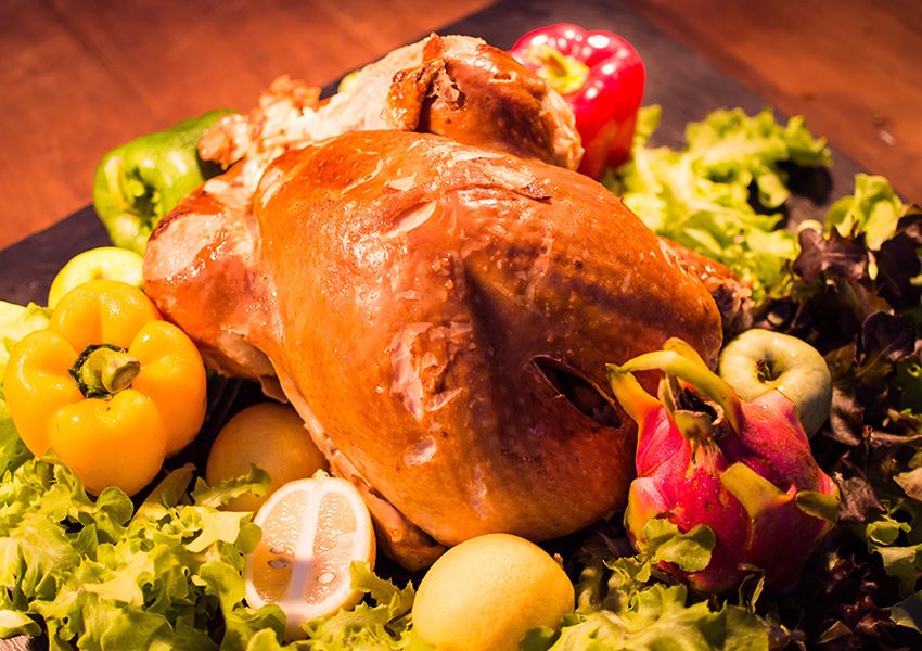 Untar el pollo con aceite de oliva, colocarlo en una bandeja para horno y ponedlo a hornear a 180° C por 70 – 80 minutos.